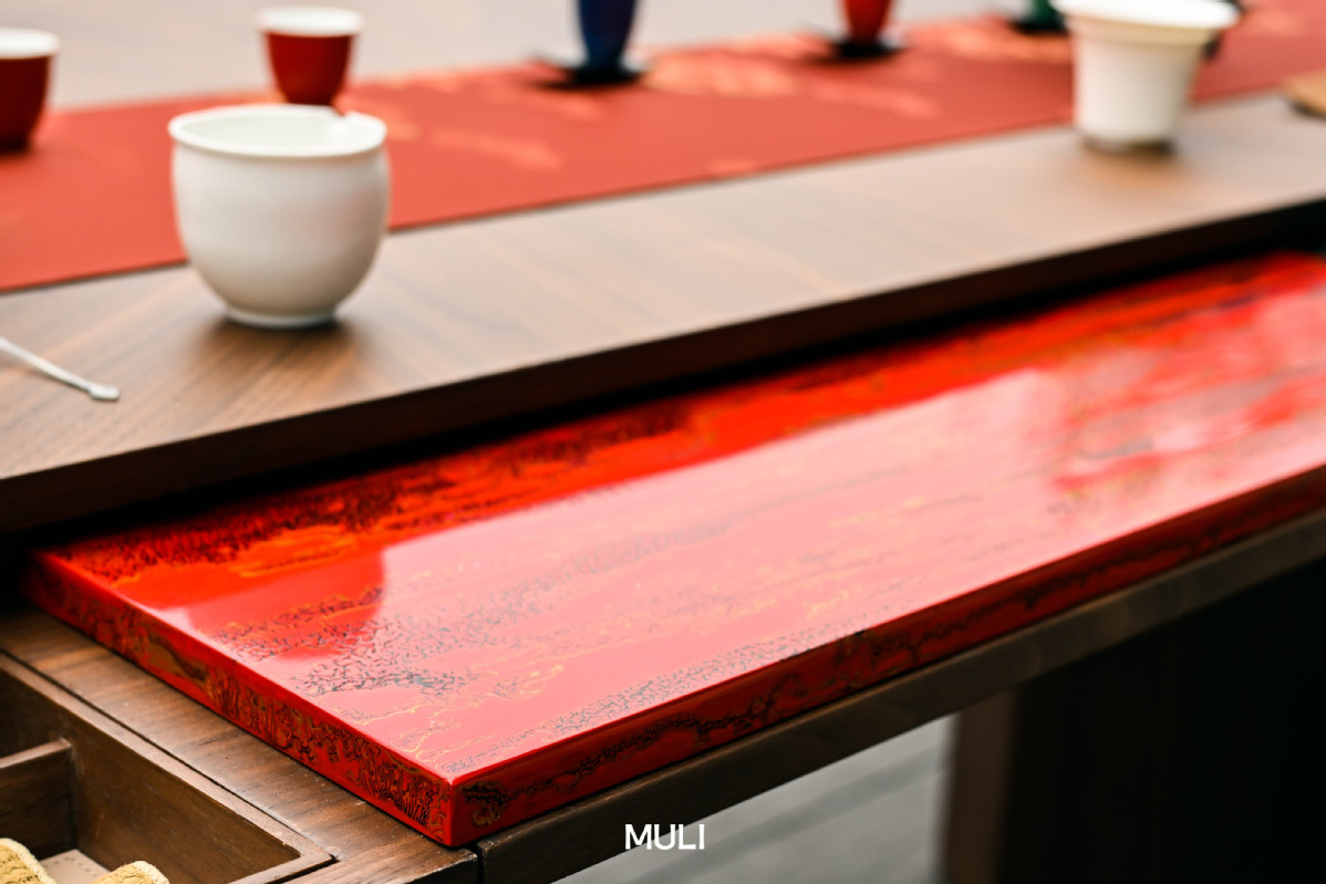 作为中国国家画院访问学者和巴黎设计周中国周特邀艺术家,龙一老师将非遗文化的大漆工艺与国潮、时尚和艺术结合起来,与木里木外共创了大漆茶桌、大漆餐桌、大漆茶具等作品,让大漆焕发新生,又赋予现代家居深厚的文化内涵与艺术魅力。